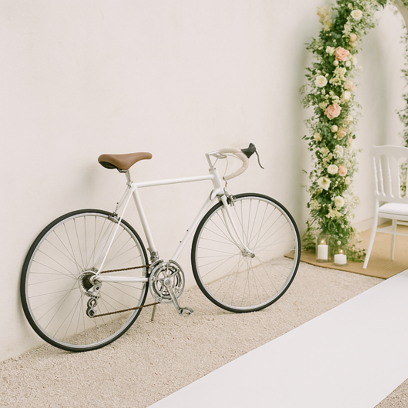 Apportez une touche originale et élégante à vos événements avec ce vélo blanc rétro. Idéal comme support décoratif, il peut être fleuri ou accessoirisé selon votre thème (mariage, garden-party, vitrine, shooting photo). Son style raffiné crée un décor unique et plein de charme.